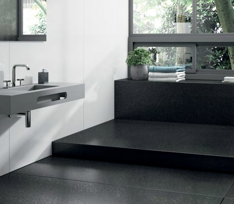 Den höga hållbarheten och motståndskraften hos Silestone® minskar slitaget då den används som badrumsgolv.
